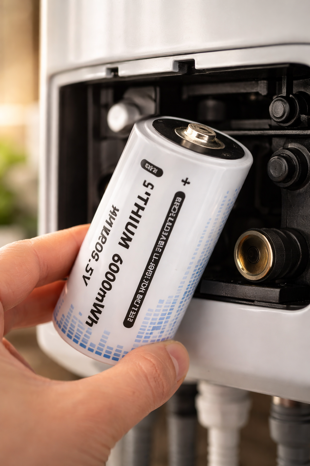 Batería recargable de alta duración ideal para calefones y equipos compatibles.