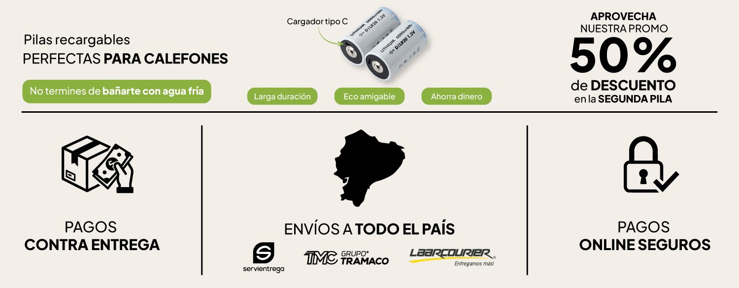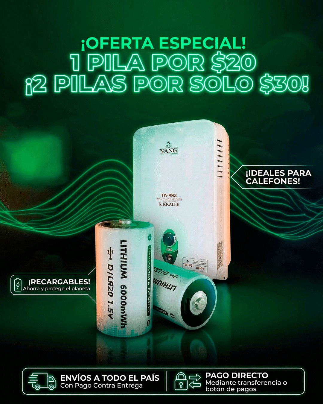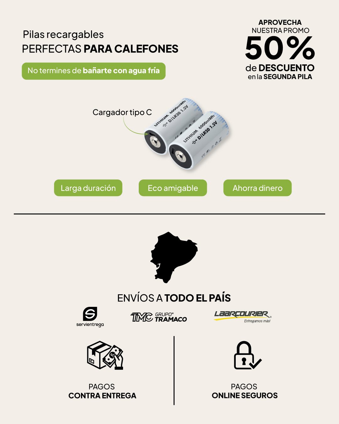 Nuestra pila recargable está diseñada para ofrecer larga duración y un rendimiento estable en el encendido del calefón. Dependiendo del uso del equipo, puede durar mucho más tiempo que las pilas convencionales, reduciendo la necesidad de reemplazos frecuentes.
